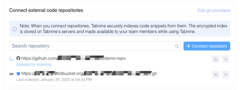 Connecting to external repositories allows Tabnine to learn from large, diverse codebases, refining its suggestions. This integration enriches the tool's context-awareness, improving the quality of code completions. Read more